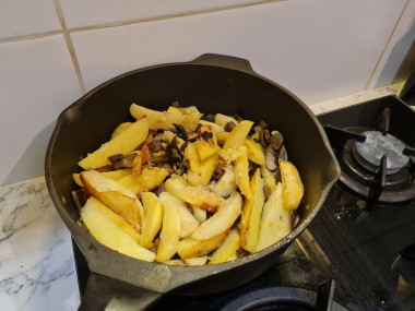 Выложите в сковороду подготовленные грибы. Перемешайте. По вкусу подсыпьте соль и специи. В качестве специи рекомендую добавить лишь молотый перец. Ароматные специи будут перебивать вкус грибов. Жарьте картофель с грибами на небольшом огне минут 15. За пару минут до готовности добавьте чеснок, пропущенный через пресс. Периодически помешивайте, чтобы не начало подгорать.