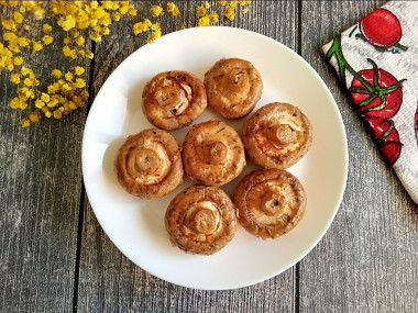 Готовые запеченные шампиньоны извлеките из духовки. За время запекания они уменьшились в размере. Переложите грибы на тарелку и подавайте к столу. Они очень вкусны как в горячем, так и холодном виде. Приятного аппетита!