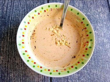 Чеснок очистите и пропустите через пресс сразу в чашу. По вкусу подсыпьте соль и специи. При добавлении соли учитывайте, что соевый соус и майонез уже соленые. Возможно, что соль вам и не понадобится. В качестве специй добавьте молотый перец и немного сушеных трав, например, базилик. Все ингредиенты смешайте до однородной массы.