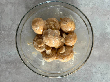 Подготовленные шампиньоны перемешайте с получившимся соусом. Делайте это тщательно, чтобы грибы полностью были им покрыты. Оставьте постоять минут на 30, чтобы промариноваться.