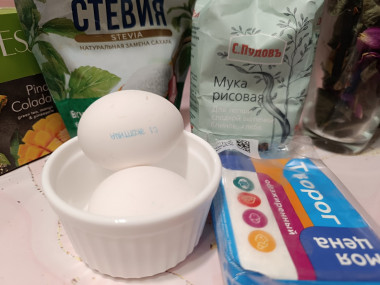 Калорийность продуктов: Творог, Рисовая мука, Молоко, Яйца, Разрыхлитель, Сахарозаменитель, Соль
