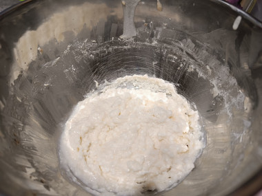 Я тоже взяла творог в брикете, он наиболее однородный и влажный. Яйца тоже крупные С0. Подсластила тесто порошком стевии, взяла половину чайной ложки. Рисовой муки мне понадобилось на одну ложку больше. Интересно наблюдать как мука моментально впитывает влагу и тесто густеет. Процесс напоминает приготовление детской порошковой каши).