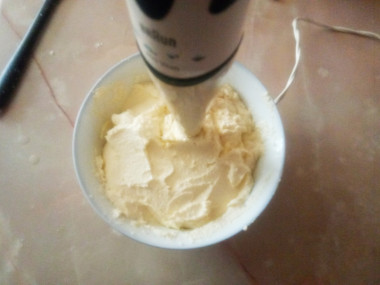 Мягкое сливочное масло взбейте с сахарной пудрой на средней скорости миксера. Масса должна стать более светлой, глянцевой, гладкой и пышной.