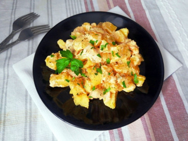 Блюдо получилось аппетитное, сочное и сытное. Мясо и картошка хорошо пропеклись, а благодаря майонезу приобрели характерную кислинку. Очень вкусно!