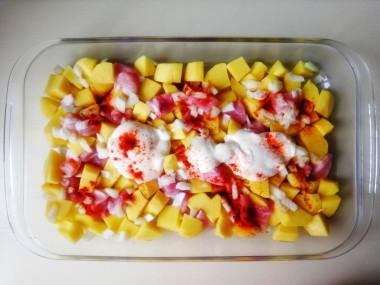 Мясо разморозила заранее. Утром пораньше принялась за готовку. Нарезала мясо и овощи. Мясо и лук отдельно мариновать не стала. Выложила их вместе с картошкой в смазанную маслом форму, добавила майонез, соль, перец, паприку, перемешала, оставила на 10 минут. Затем добавила в форму немного воды, закрыла ее фольгой и отправила в духовку на 1 час.