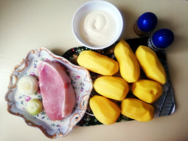 Как запечь свинину кусочками с картошкой в духовке? Подготовить указанные ингредиенты. Лук и картофель лучше сразу очистить. Можно взять смесь майонеза и сметаны.