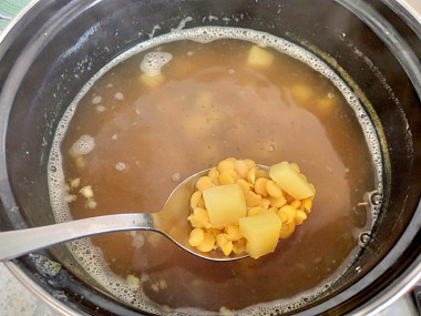 Чтобы горох идеально разварился и суп получился вкусным, воспользуйтесь небольшим секретом. Залейте сухой горох (замачивать не нужно) небольшим количеством кипящей воды. Добавьте немного соли, на кончике ножа молотую корицу, лавровый лист и растительное масло. Доведите до кипения и варите до разбухания гороха. Если воды недостаточно, долейте необходимое количество. Так не придется стоять у плиты, постоянно снимая пену.
