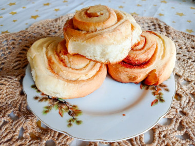 Из этого теста я сделала такие же булочки с корицей, как и в рецепте. Выпекала их 20 минут при 190 градусах.