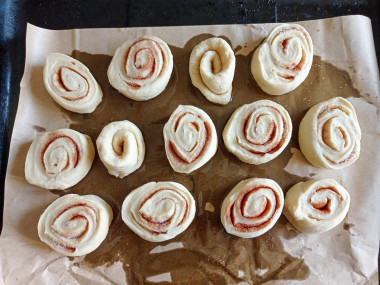 Нарежьте рулет на кусочки, оставьте для расстойки минут на 15. Затем смажьте верх булочек желтком и выпекайте при 180 градусах минут 20-25. Ориентируйтесь по своей духовке.