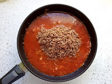 Всыпьте гречку и разровняйте. Перемешивать ее с мясом не нужно.