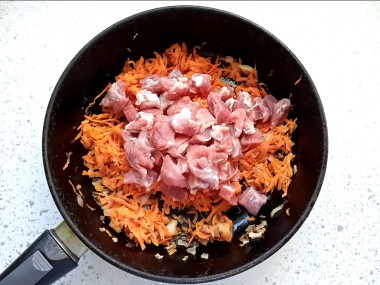 В казане или в глубокой сковороде на сильном огне разогрейте растительное масло. Выложите мясо и обжарьте, помешивая, 10-15 минут до полуготовности.
