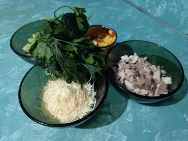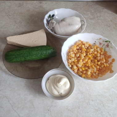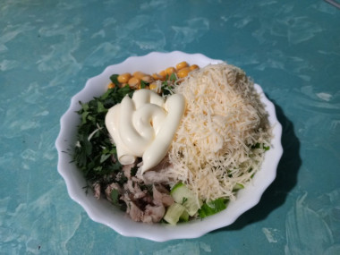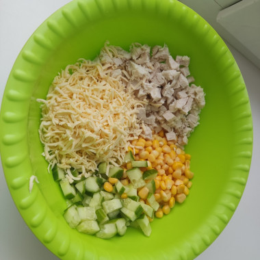 Куриную грудку предварительно отварила, остудила и нарезала кубиками. Огурец также порезала кубиками, сыр натерла на мелкой тёрке. С кукурузы слила жидкость.