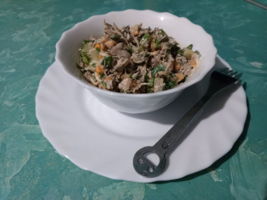 Чудесный салатик. Прост в приговлении, не требует уникальных продуктов, можно сделать буквально из того, что есть в холодильнике. Зелень, специи подбираются по своему вкусу.