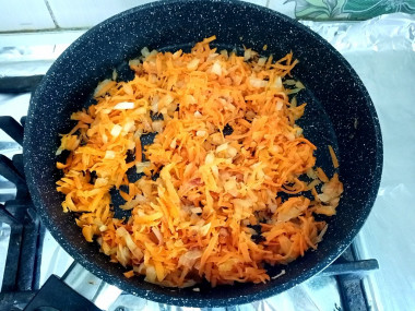 Сковороду разогрейте до горячего состояния и налейте на неё немного растительного масла. Выложите лук и морковь. Помешивая, обжаривайте овощи 3-5 минут. За время обжарки лук и морковь станут мягче.