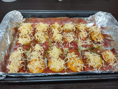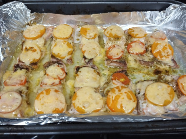 Выложила кружочки помидорок на филе, сверху посыпала сыром и отправила в духовой шкаф запекаться при 180° 20 минут.