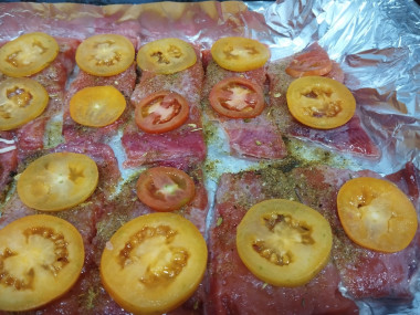 Оставьте рыбу постоять и промариноваться, а пока подготовьте другие ингредиенты. Помидоры помойте и нарежьте тонкими кружочками или полукружьями, в зависимости от размера кусков рыбы.
