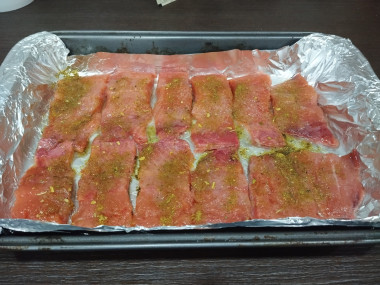Куски рыбы аккуратно промойте и хорошо обсушите бумажными полотенцами — лишняя влага сделает блюдо водянистым. Возьмите подходящую форму для запекания. Капните на дно немного растительного масла без запаха. Выложите в форму куски рыбы, размазывая ими масло по дну. Посолите и сдобрите рыбу специями. Я взяла молотый перец, вы можете использовать свои любимые. Сбрызните куски лимонным соком.