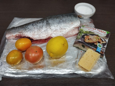 Как запечь красную рыбу с помидорами и сыром в духовке? Подготовьте продукты. Рыба подойдет любая — лосось, семга, кета, горбуша, у меня форель. Возьмите готовые стейки или филе. Или разделайте целую рыбу сами.
