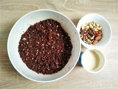 Грецкие орехи и миндаль моем, просушиваем в микроволновой печи, чтобы они стали хрустящими. Скалкой или блендером измельчаем их в крошку. По желанию вместо грецкого ореха можно использовать любые другие, например, миндаль или смесь орехов.