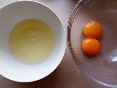 Яйца разделите на желтки и белки. Важно, чтобы при разделении в белок не попало ни капли желтка, иначе в пену он не взобьется. Белки уберите в холодильник. Желтки соедините с сахаром и ванилином или ванильным ароматизатором и взбейте миксером добела.