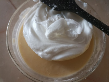 Аккуратно лопаткой подмешайте взбитые белки в тесто. Тесто должно получиться воздушное, пышное.
