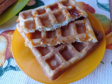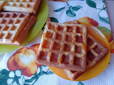 Вафельницу предварительно разогрейте. Вылейте немного теста. Закройте крышку прибора и выпекайте вафли в электровафельнице 4-6 минут до золотистого цвета. Если вафли прилипают к поверхности вафельницы, можно перед выпеканием каждой вафли смазывать панели растительным или растопленным сливочным маслом.