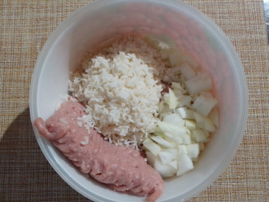 Фарш взяла из индейки, рис - длиннозёрный пропаренный. Его как и рекомендовалось промыла и залила на 10 минут кипятком.