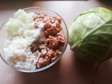 В миске соедините свиной и куриный фарш, рис, лук соль и перец. Тщательно перемешайте до однородности. По желанию можете добавить в фарш свои специи по вкусу.