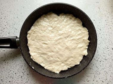 Возьмите сковороду с антипригарным дном. Капните на нее немного растительного масла. Рукой размажьте его по дну. Этой же смазанной рукой возьмите тесто и равномерно разомните его тонким слоем. У меня сковорода 24см диаметром, как раз хватило всего теста.
