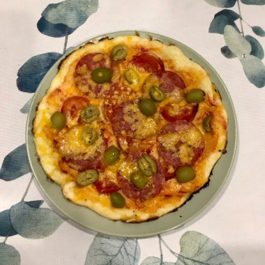 Я всегда делала пиццу на сковороде из жидкого теста, а тут вполне густое. Только распределять его легче всего руками, смазанными растительным маслом. На мою сковороду диаметром 24 см. как раз хватило. В соус я добавила каплю майонеза для большей сочности. Колбасу, помидор и перчик нарезала небольшими кусочками, нам так удобнее есть. Маслины мы не любим, не добавляла их. А сыра насыпала много, при расплавлении он так аппетитно тянется! Жарила пиццу под крышкой до тех пор, пока не подрумянилась основа. Даже не ожидала, что тесто получится таким пористым и хорошо поднимется. Просто чудесная основа! Начинка очень сочная. Муж с дочкой даже не поняли, что пицца выпекалась не в духовке). Возьму этот рецепт за основу и буду "жарить" пиццу с разными начинками.