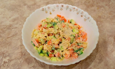 Сложите измельченные продукты в одну посуду, добавьте майонез. По желанию можете заправить салат подсолнечным или оливковым маслом вместо майонеза.