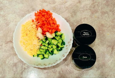 Отличный летний салат! Ем его в жару на завтрак, обед и ужин. Морковка и огурец придают блюду освежающие нотки, а за счет сыра оно получается не пресным. А для более насыщенного вкуса я добавила в салатик несколько долек чеснока