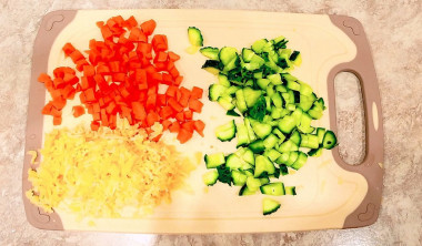 Салат будет красиво и аккуратно смотреться, если нарезать все ингредиенты одинаковыми по размеру и форме кусочками (например, кубиками или соломкой).