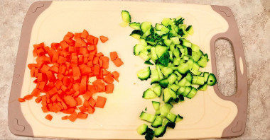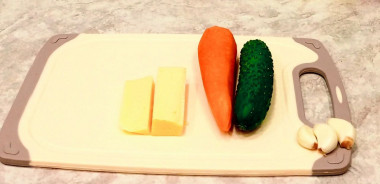 Свежие овощи - это не только вкусно, но и очень полезно! Поэтому я сделала прекрасный салат морковь сыр огурец на ужин. Огурец я нарезала брусочками, а пару морковок натерла на крупной тёрке. Если бы не торопилась, то сделала бы это на тёрке для корейских салатов). Твердый сыр заменила на плавленый, он хорошо натерся на длинные полоски. Чеснок измельчила не средней тёрке. Мне не хотелось заправлять такой замечательный салат майонезом, поэтому заменила его на оливковое масло. Нам понравилось сочетание продуктов: сочность овощей и мягкость сыра. Чеснок не только придает аппетитный аромат салату, но и приятную остринку.