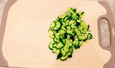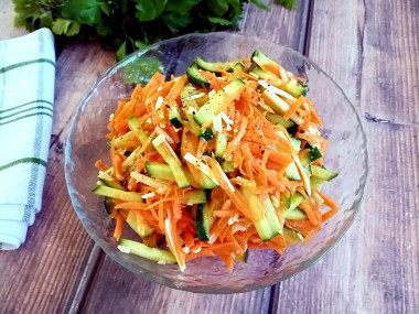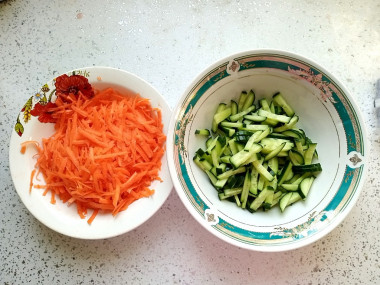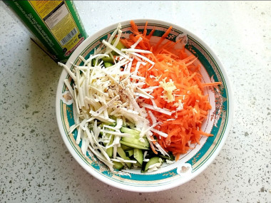 Огурцы хорошо вымойте и нарежьте тонкой соломкой. По желанию можете снять кожицу с огурцов, тогда салат получится нежнее.