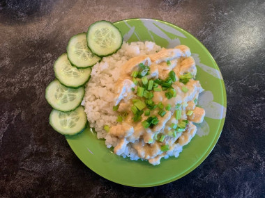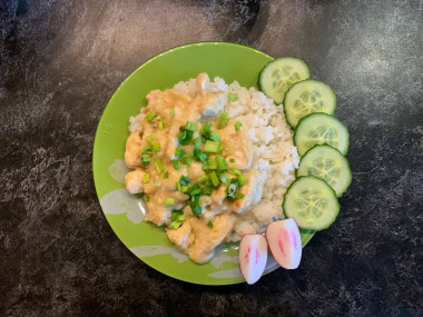 Всегда было интересно попробовать блюда индийской кухни. Карри у меня не было, добавила паприку, мускатный орех. Свежий чеснок заменила на сушенный. Когда что-то готовлю со сливками всегда добавляю немного муки - так сливки не "выпадут в осадок" и подлива получится густой и очень вкусной. Подскажите, пожалуйста: