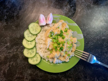 На тарелку выложите готовый рис, а в центр курочку. Блюдо можно посыпать сверху свежей зеленью. Рис с курицей в соусе карри готов. Приятного аппетита!