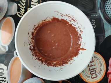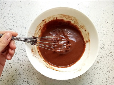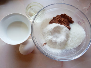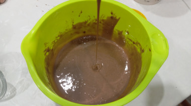Тесто я замесила как указано в рецепте. Сначала сухие ингридиенты, затем добавила крупное яйцо, растительное масло и молоко. От себя положила ванилина на кончике ножа. Тесто получилось блестящим, гладким, но густоватым. Поэтому добавила еще ложку молока. Решила, что в следующий раз какао буду отмерять "под нож".