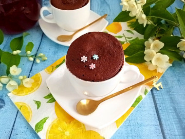 Подавайте шоколадный кекс в той же чашке, в которой он выпекался. Верх можете украсить взбитыми сливками, ягодами, шоколадом. Приятного аппетита!
