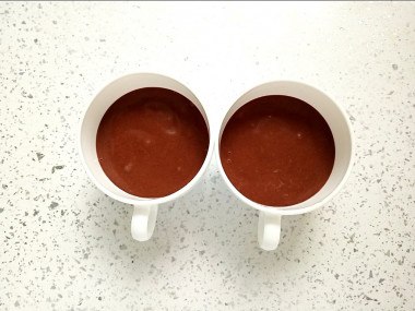 Возьмите подходящие чашки. Обратите внимание, чтобы на них не было золотых или серебряных ободков — такие чашки могут начать искрить в микроволновке. Разлейте тесто по чашкам, заполняя их на 2/3 от объема, не больше — тесто при выпечке сильно вырастает и может убежать. У меня получились две чашки, объемом 100 и 150 мл.
