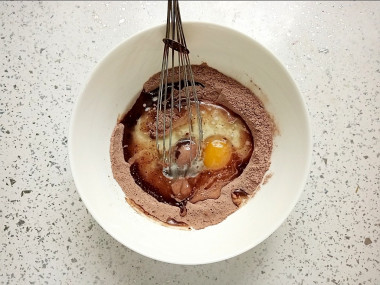 Влейте в миску к сухой смеси молоко, затем растительное масло. Вбейте яйцо. Перемешайте тесто до полной однородности. Это займет у вас совсем немного времени, не больше минуты.