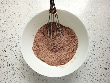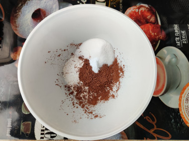Всыпьте в миску все сухие ингредиенты — муку, какао, сахар и разрыхлитель. Перемешайте их до однородности. Я специально буду делать все вилкой, имитируя некухонные условия. А вообще можно воспользоваться венчиком.