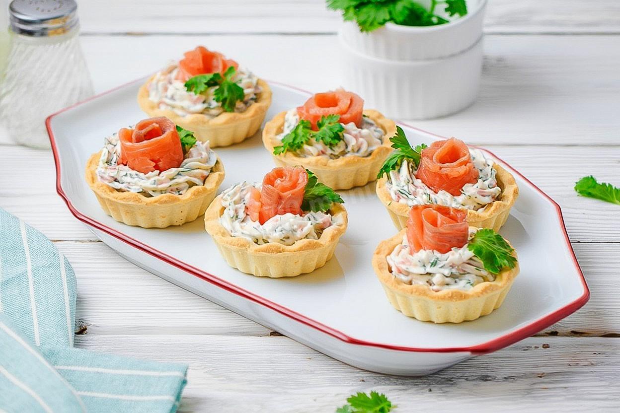 Оставшуюся рыбу нарежьте на длинные тонкие полоски. Сверните каждую полоску спиралью - это будет украшение розочка. Установите розочку из рыбы в центр каждой тарталетки.