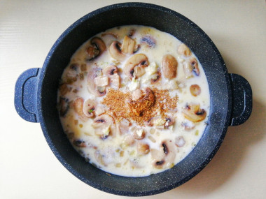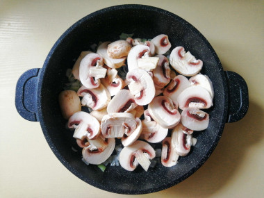 Добавьте измельченные грибы. Жарьте, помешивая, до золотистого цвета. Перед добавлением сливок огонь сделайте минимальным.
