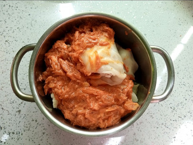 Затем выложите снова голубцы и залейте оставшейся томатной заливкой. Если томатной заливки не хватило, то долейте в кастрюлю горячей воды, чтобы голубцы с овощами были полностью покрыты.