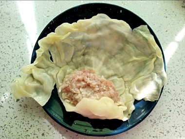 Для отваривания кочана выберите большую просторную кастрюлю, чтобы между кочаном и стенками было досточно свободного места. Поместите кочан в кастрюлю, залейте водой, доведите до кипения. Проварите капусту около 2 минут. За это время верхние листья станут мягкими. С помощью вилки придерживайте кочан и ножом отрежьте пару верхних листьев у основания. Аккуратно, чтобы не обжечься, снимите листья с кочана.