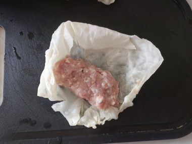Рис для фарша взяла круглозерный, хорошо его промыла и отварила в течение 5 минут. Потом еще раз промыла холодной водой, чтобы зернышки не склеились. Фарш сделала из куска свинины, лук пропустила через мясорубку вместе с фаршем. У капустных листов старалась вырезать утолщения или отбивала их молоточком.