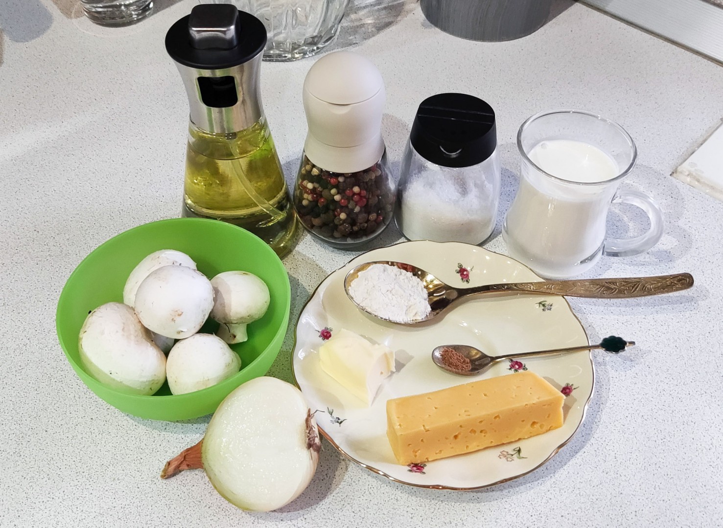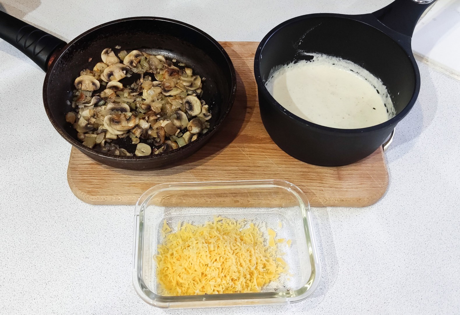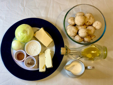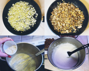 С начала помыла и подготовила все продукты. В сковороде разогрела 2 ложки растительного масла и начала обжаривать лук. В это же время нарезала грибы. Добавила грибы к луку и все пережарила, добавив еще масла для грибов. Посолила. Убавила огонь. Пока испарялась влага из грибов, начала делать соус. Растопила масло в кастрюле, всыпала дождиком муку и начала быстро мешать. Затем, в 3-4 захода добавляла сливки. Каждый раз активно мешала венчиком, чтобы не было комочков и сливки равномерно прогревались. Довела до первых пузырей и сразу выключила. Но, продолжала мешать, так как соус немного кипел. Добавила соль, мускатный орех, черный молотый перец. Выключила нагрев у грибов и начала тереть сыр.