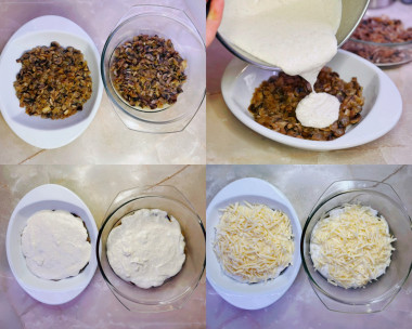 Возьмите порционные формочки для жульена. Выложите в них обжаренные грибы. У меня получилось 3 неполных формы, можно было уместить и в двух.