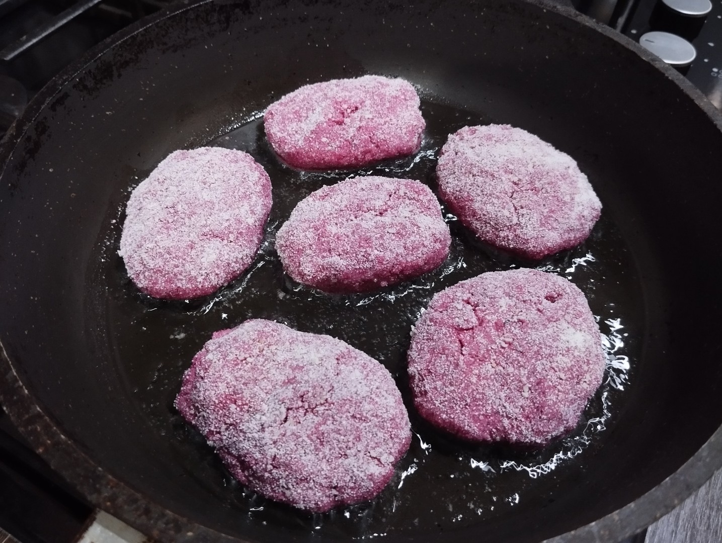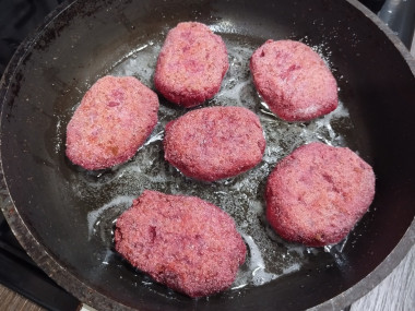 И аккуратно чистыми руками сформируйте плотные свекольные котлеты в панировке. На сковороду налейте растительное масло. Разогрейте его. О том, как выбрать сковороду и идеальное для жарки масло читайте в отдельных статьях, ссылки под шагами.